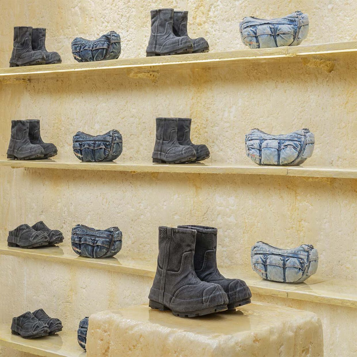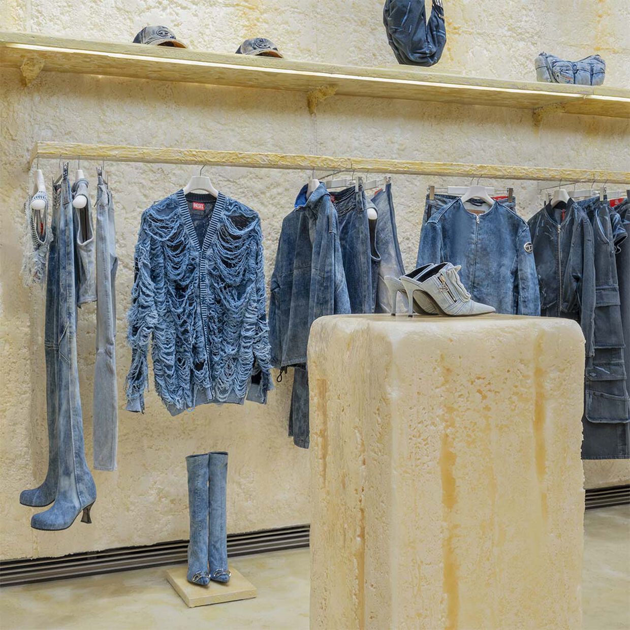 Podeste und Regale, die ebenfalls mit derselben Behandlung überzogen sind, präsentieren die exklusiv für den Denim Takeover Space kreierte geschlechtsneutrale Kapselkollektion.